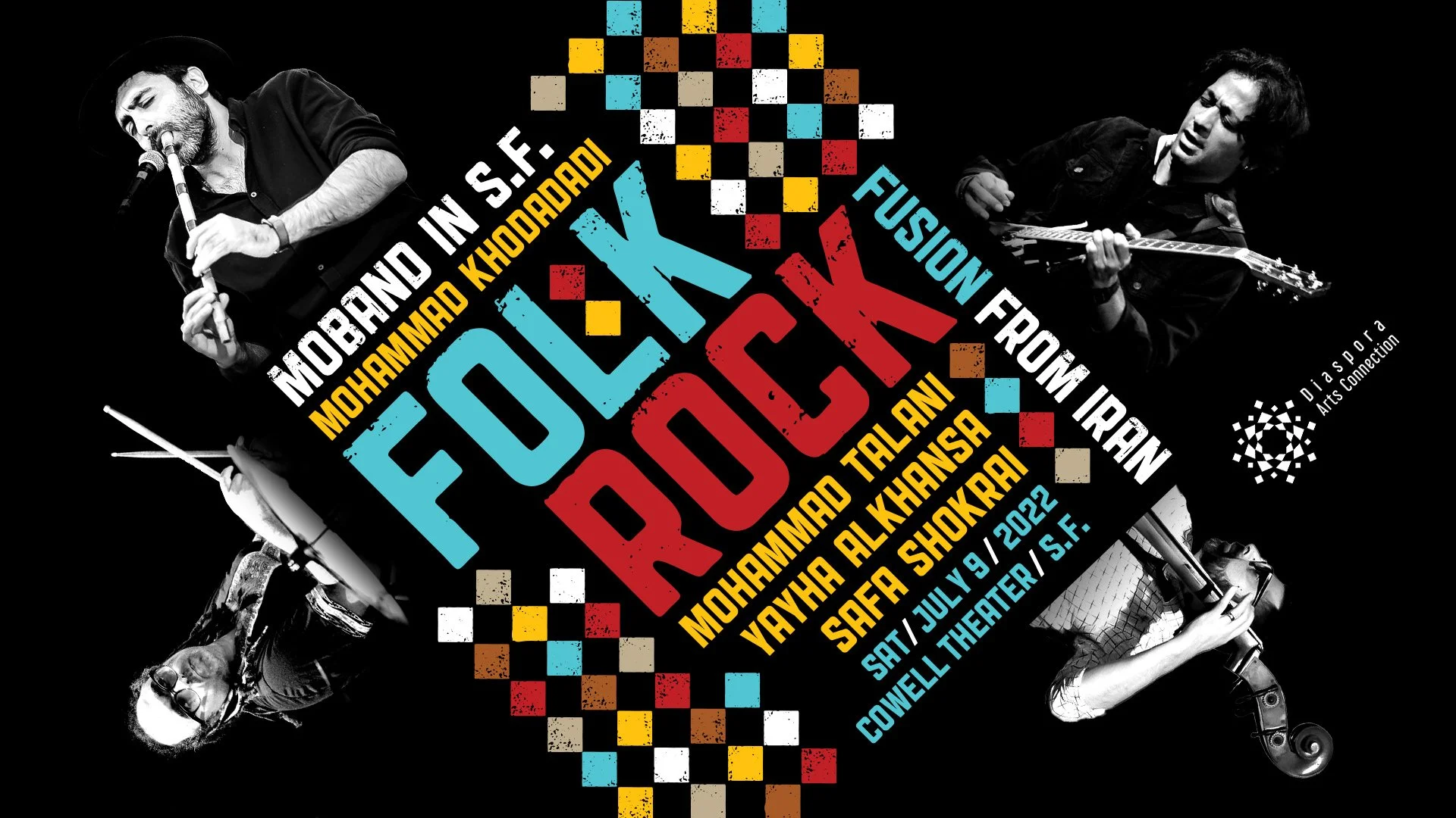 Diaspora Arts Connection proudly presents Moband in San Francisco on Saturday, July 9th at 7:00 pm at Fort Mason's Cowell Theater. Please join us for a delightful presentation by band members Mohammad Khodadadi, Mohammad Talani (guitar, arrangement), Yahya Alkhansa (percussion), and Safa Shokrai (bass).